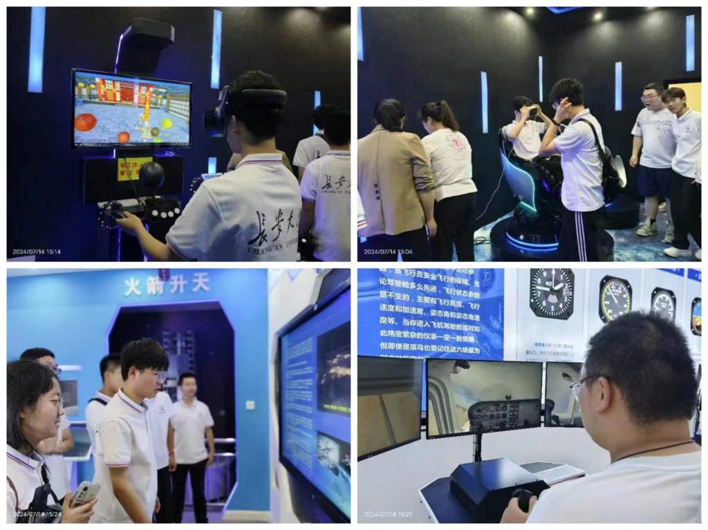 实践队成员参观的第一个展厅是VR虚拟馆。在这里,队员们体验了先进的VR设备,仿佛置身于一个全新的虚拟世界;紧接着,走进了5D影院,通过一场刺激的过山车体验,我们感受了一场视觉与感官的震撼之旅;航天馆则为我们展示了中国的航天发展之路,实践队成员了解到了中国航天发展的艰辛历程;模拟飞行体验让我们仿佛置身于真正的飞机中,“点火,加油,抬杆”,一系列操作让眼前的飞机缓缓起飞,似乎身临其境,翱翔在蓝天之上。