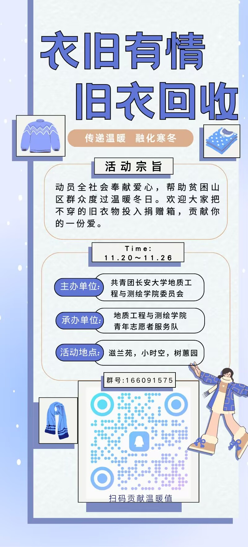 “寒冬虽冷,暖意犹在。”冬日的寒冷并不会冻结我们炽热的爱心。“旧衣回收”活动已经开启,行动就在当下,让我们每个人都参与其中,贡献自己的一份力量,让这个冬天不再那么寒冷,让那些贫穷的人感受到我的爱,同时也使得自己的人生更有意义。更多活动内容详见下面的群,欢迎有意向的同学进群了解情况。