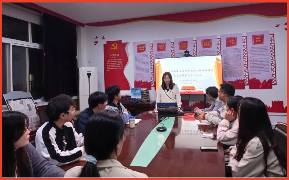 为深入学习贯彻全国宣传思想文化工作会议精神思想主题教育,加强党员对习近平新时代中国特色社会主义思想的认识。必赢76net线路官网23级物探硕士党支部10月上旬在南校区东院第二教学楼107会议室开展了相关的学习活动。会议由支部书记周梅同志主持,全体党员参与。