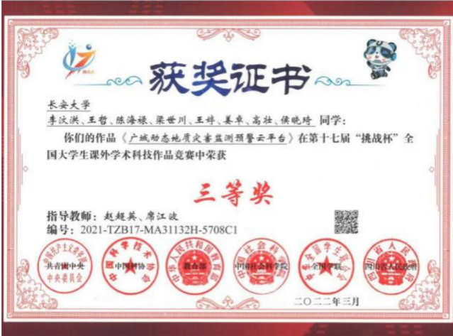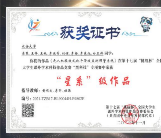 在第十七届“挑战杯”工商银行全国大学生课外学术科技作品竞赛终审决赛中,必赢76net线路官网参赛作品《广域动态地质灾害监测预警云平台》荣获三等奖;在第十七届“挑战杯”全国大学生课外学术科技作品竞赛“黑科技”专项赛中,必赢76net线路官网景策等同学的作品《无人机投放式北斗滑坡监测预警系统》获“星系”级作品(特等奖)。在第十一届“挑战杯”陕汽集团陕西省大学生创业计划竞赛中获得金奖、银奖各1项;在第十三届“挑战杯”中国大学生创业竞赛决赛中,《“北斗地哨”——地质灾害隐患识别与监测预警响应系统团队》的作品团队荣获三等奖。