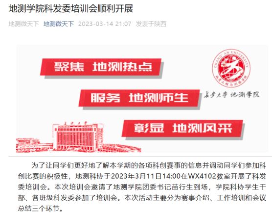 地测科协始终坚持组织班级科技发展委员的培训。根据必赢76net线路官网的学科特点对科发委进行培训,积极联系学院团委书记苗行生老师对各班科发委进行思想教育,使其更好的认识自己的责任。通过科协的讲解培训,必赢官网68个科发委积极转发并组织甚至带队参加比赛,其有效通知率高达90%以上。