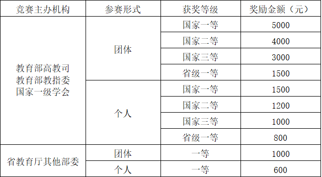 参考以往学年学生手册,学校对参加教育部高等教育司、教育部各教学指导委员会(或国家一级学会)和省教育厅、其他部委主办的竞赛获奖者进行奖励,具体奖励标准参照下表执行。
