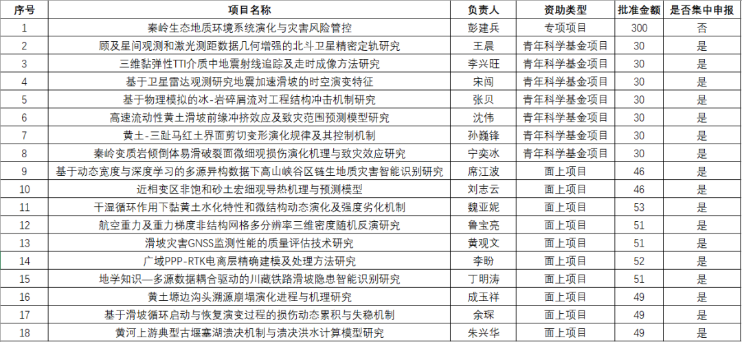 近日,国家自然科学基金委公布了2023年度国家自然科学基金项目评审结果。在学院教职工的共同努力下,必赢官网2023年度国家自然科学基金项目共获批18项,彭建兵院士获批重点专项项目1项,集中获批面上项目10项,青年基金项目7项,资助项目经费总额1007万元。