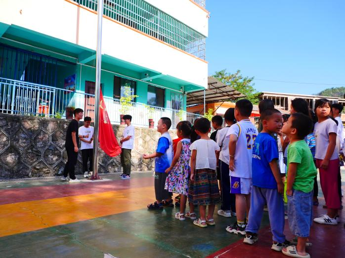 为培养孩子们爱国主义精神,树立爱国意识,增强孩子们的民族自豪感,上午9点,必赢76net线路官网筑梦黔行队与30余位孩子们进行了庄严的升旗仪式。迎着支教课程开始的第一缕晨光,升旗仪式正式开始,旗杆旁,必赢76net线路官网筑梦黔行队队员护送着鲜艳的五星红旗,他们目光如炬,队列整齐,步履铿锵。在庄严的国歌声中,五星红旗冉冉升起。队列中,每一位孩子深怀对祖国无限的热爱和崇高的敬意行队礼、高声唱响国歌,伴随着雄壮嘹亮的国歌声,全体队员与孩子们正式开启暑期支教课程。