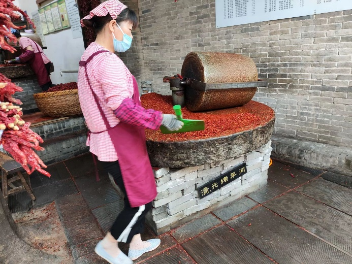 在袁家村,红彤彤的辣椒色是它美食的象征。正如关中八大怪所说“油泼辣子一道菜”,陕西辣椒与川椒不一样,椒身细长肉质丰厚色红味辣,袁家村辣子主营各种干辣椒以及油泼辣子。在作坊门口,磨盘时时刻刻都在碾辣椒,为的就是能远远不断地为各地游客提供原材料,也让游客亲眼看见制作过程,让游客吃的安心,买的放心。