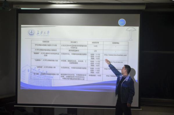 会议伊始,杨海城老师详细介绍了创新创业竞赛活动的基本流程,并和同学们分享了自身参与比赛的经验,提出“动手要早、立意要巧、贵在坚持”三点建议,希望同学们能够脚踏实地,夯实专业基础,相信“书山有路勤为径,学海无涯苦作舟”。
